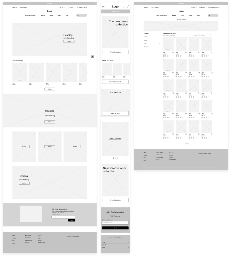 Low-Fidelity Wireframes: Once I had an idea of the layout, I created a low-fidelity wireframe of the homepage for both desktop and mobile. I then created wireframes for other pages in the task flow including a categories page, product details page, shopping cart page, and the first step in the check out process page.