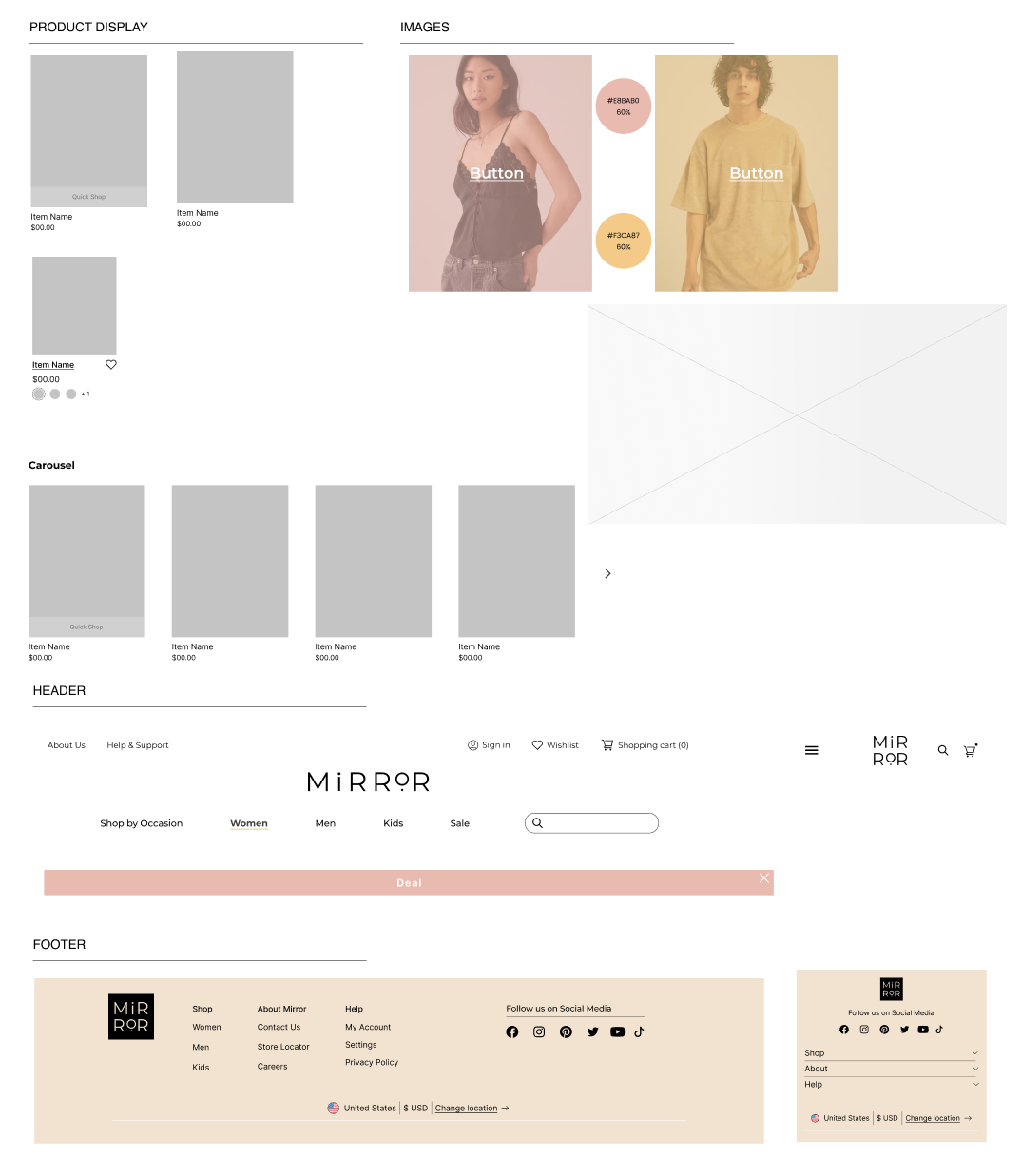 UI Kit: Now that I had wireframes of the pages, I shifted my focus on building a brand identity for Mirror. I created a logo and chose the typography and color palette that I felt best represented the brand’s fresh and simple aesthetic. From there, I built a UI Kit that reflects their brand and will create a cohesive look throughout the designs.